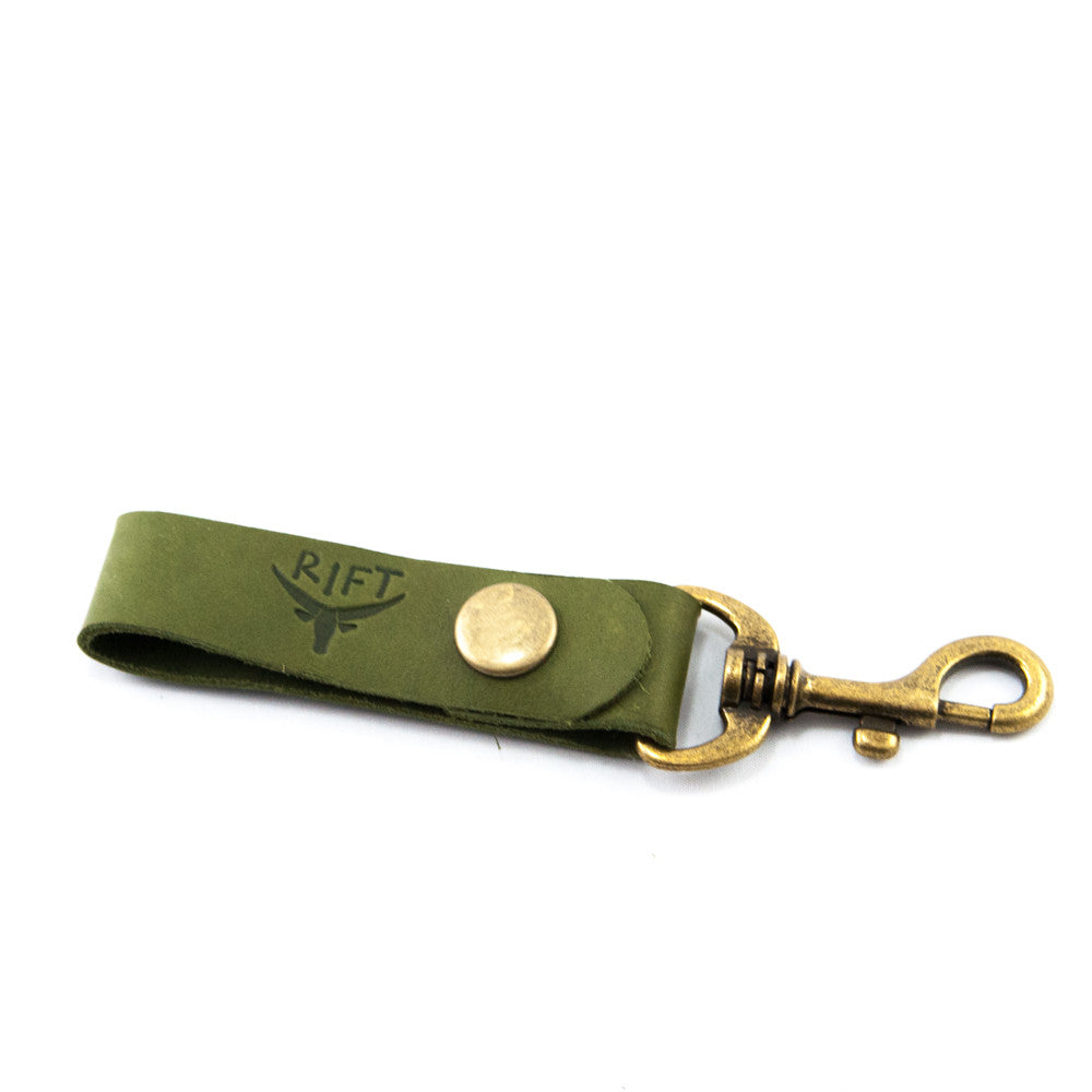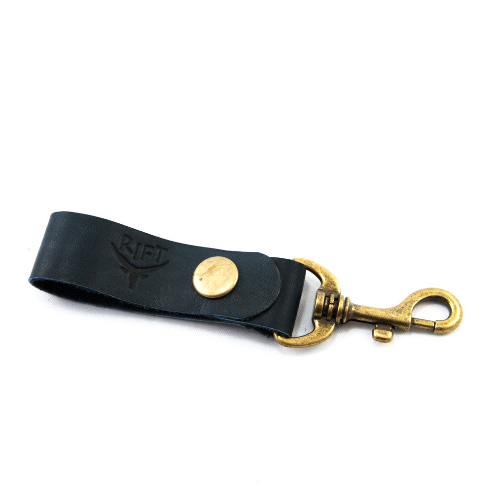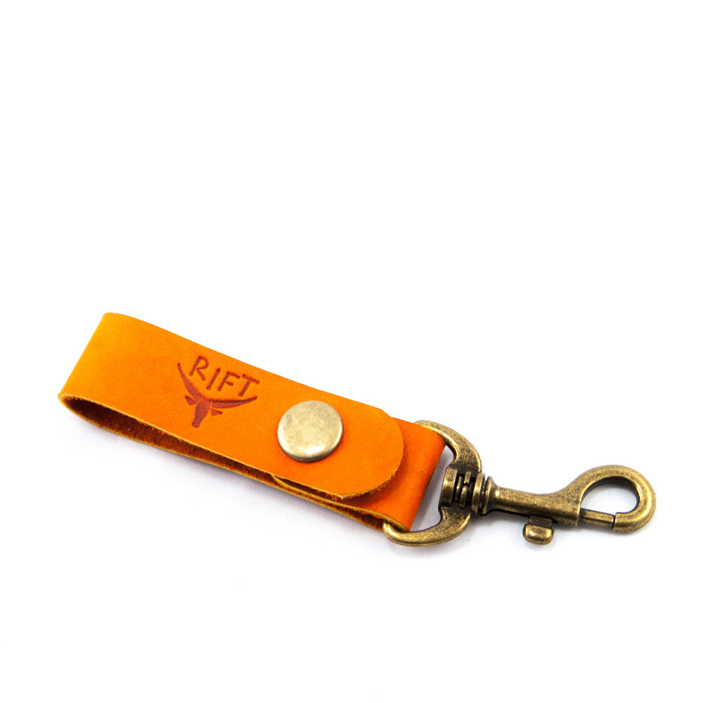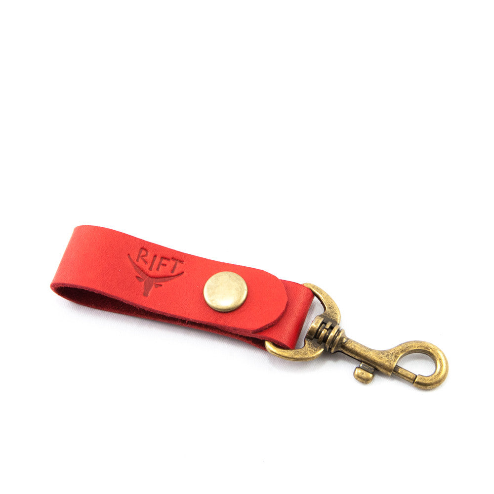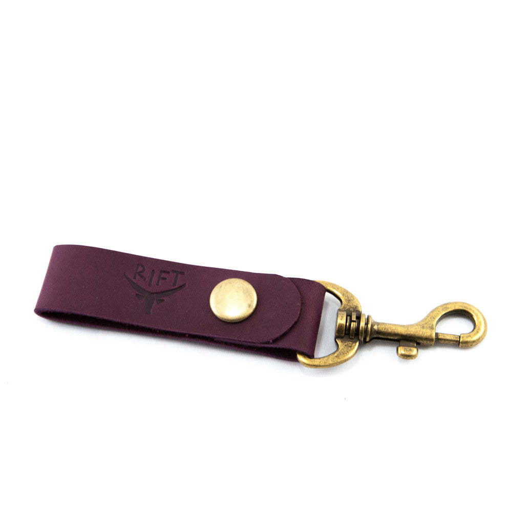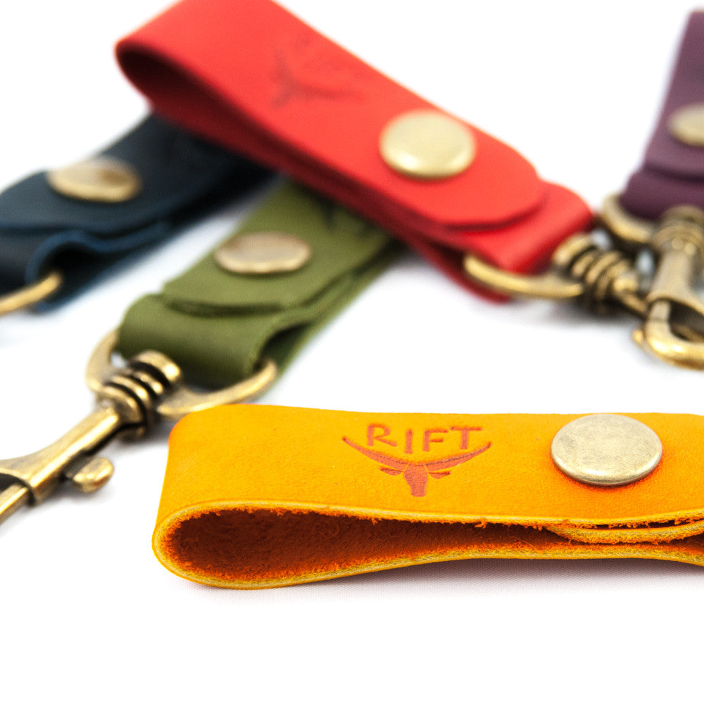 Leather snap key ring with brass trigger clip. Available in red, orange, purple, navy, and olive.